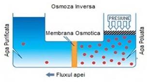4 ) Membrana osmotica filtreaza apa la o finete de 0,0001 microni, eliminand 95-98% din saruri si substantele dizolvate, inclusiv bacteriile si virusii, rezultand astfel apa pura. Pentru realizarea procesului este necesara o sursa de presiune de minimum 1.5 bari.
